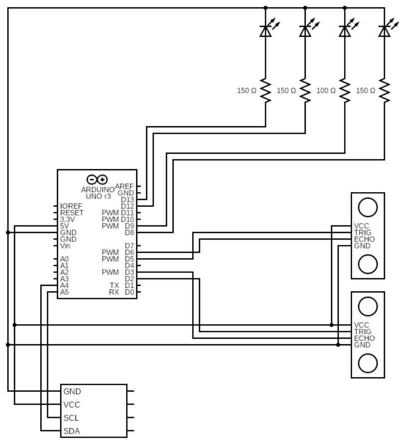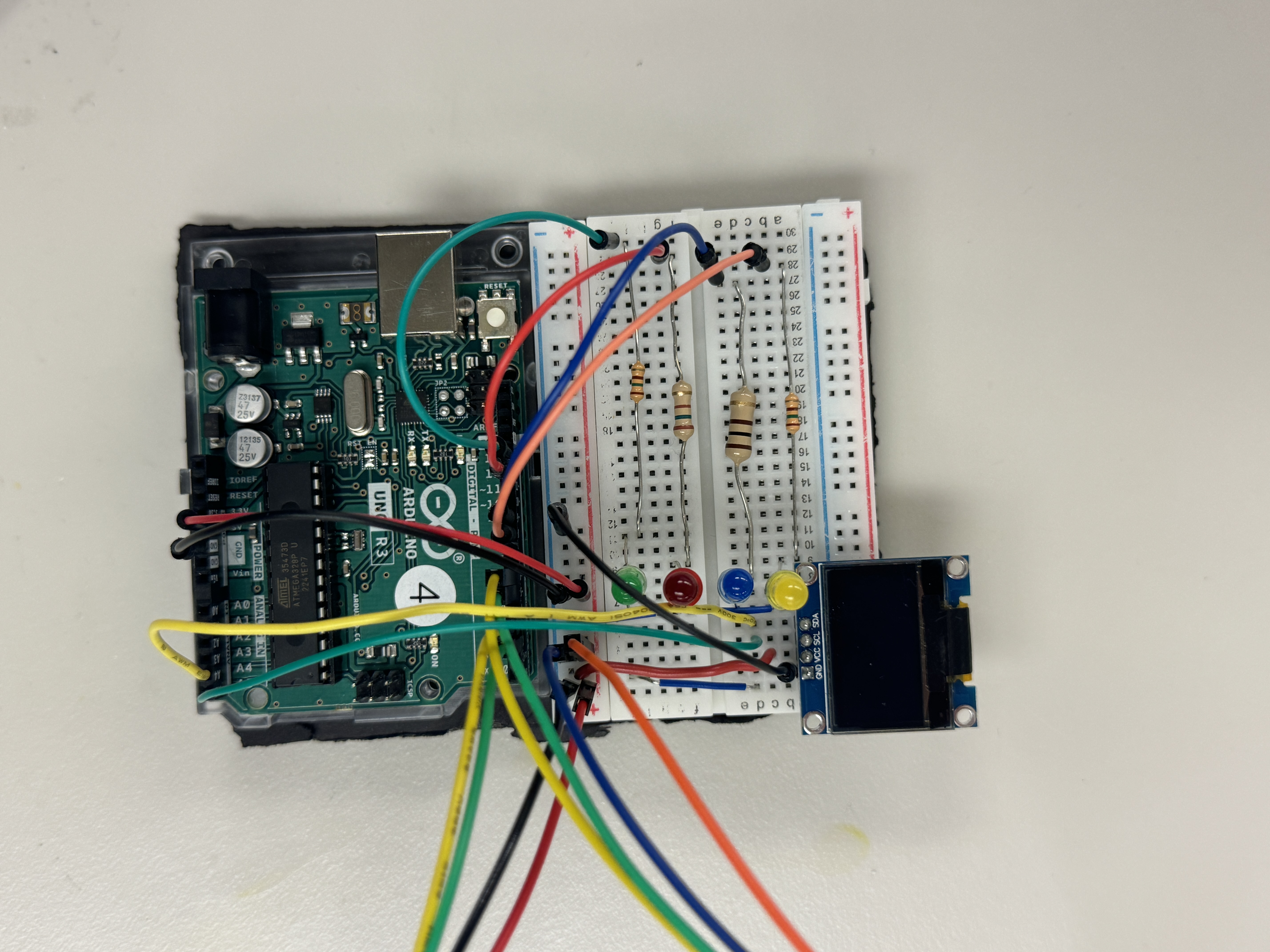 The device is built around an Arduino Uno microcontroller. We used two ultrasonic distance sensors to track head movements. To show the inputs, we added four LEDs and also included an OLED module for a clearer display of the inputs. A diagram and image of the circuit is included below.